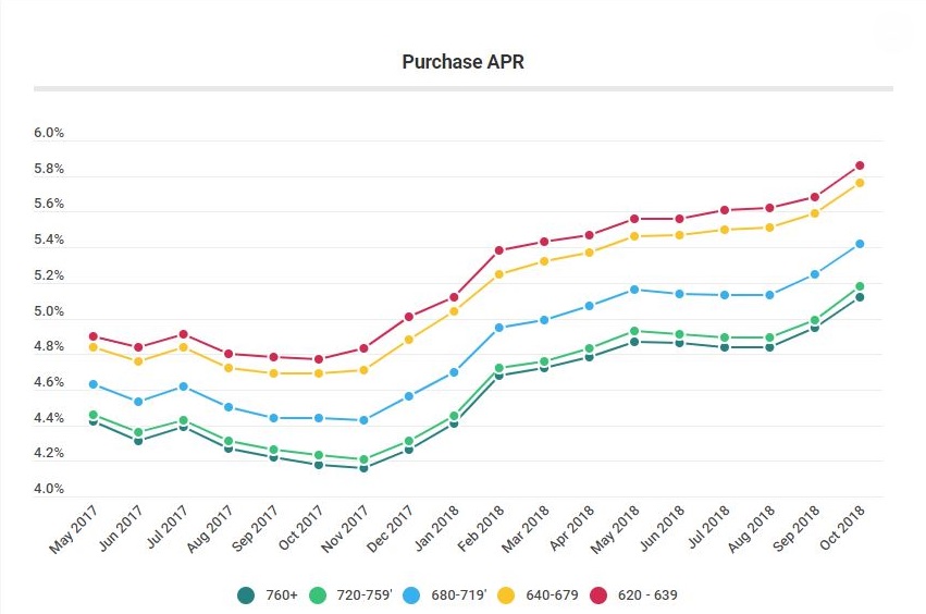 - Consumers with the highest credit scores (760-plus, representing the 65th percentile of borrowers) received an average APR of 5.12%, versus 5.42% for consumers with scores of 680 to 719. The APR spread of 30 bps between these score ranges is the same as it was in September. For the average purchase loan amount of $233,938, the spread represents over $15,000 in additional costs for borrowers with lower credit scores over 30 years. The additional costs result from higher interest rates, larger fees or a combination of the two.