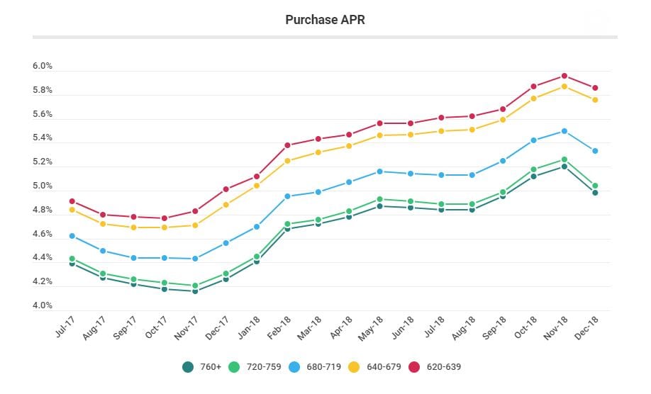 - Consumers with the highest credit scores (760+, representing the 65th percentile of borrowers) received an average APR of 4.98%, versus 5.33% for consumers with scores of 680 to 719. The APR spread of 65 basis points between these score ranges is higher than it was in November. For the average purchase loan amount of $224,609, the spread represents over $17,000 in additional costs for borrowers with lower credit scores over 30 years. The additional costs result from higher interest rates, larger fees or a combination of the two.