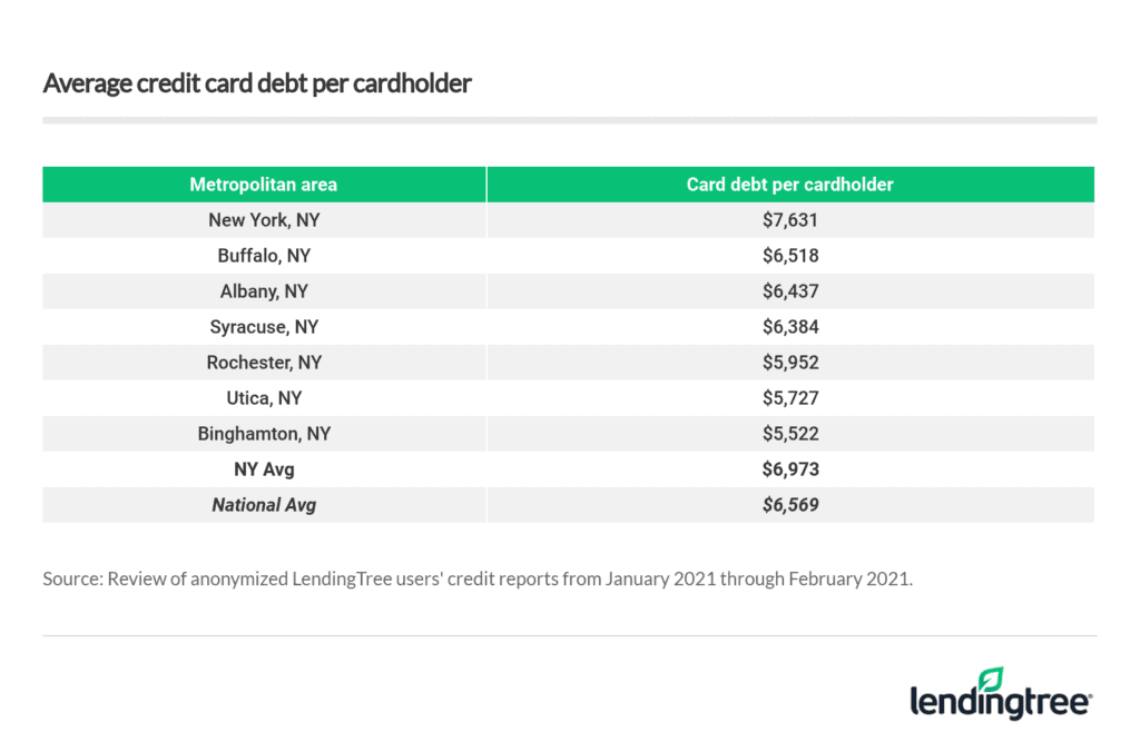 New York City residents have by far the most credit card debt among New York state’s biggest metropolitan areas. The average cardholder there owes $7,631. That’s about $1,000 more than the city with the second-most debt, which is Buffalo.
