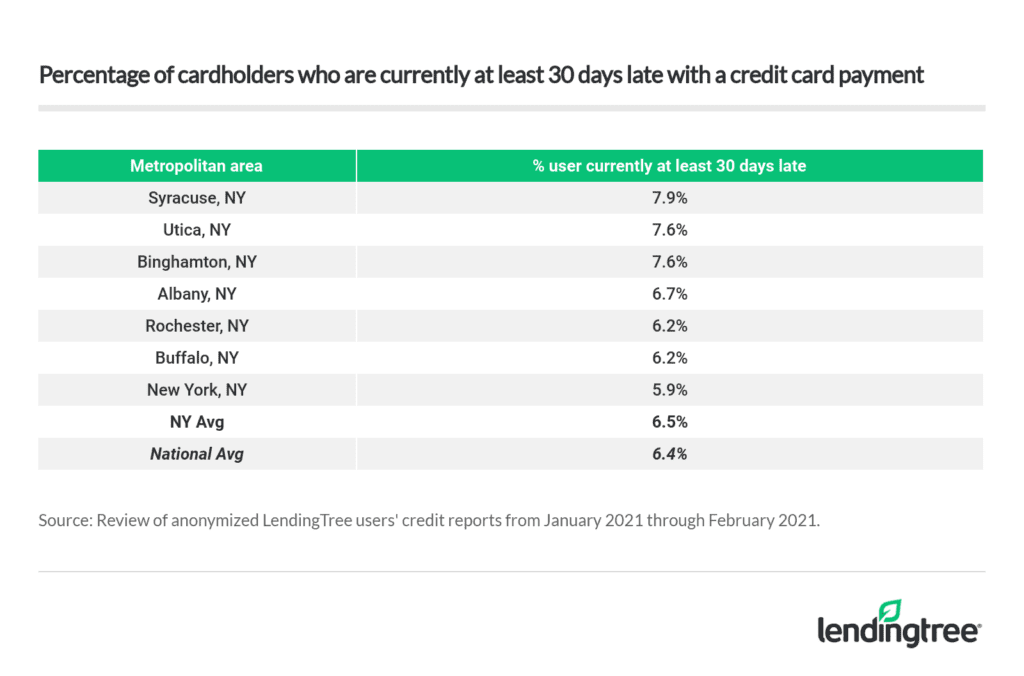 Syracuse cardholders are the most likely culprits, with 7.9% of cardholders currently late with a payment. On the flip side, just 5.9% of New York City cardholders are currently late.