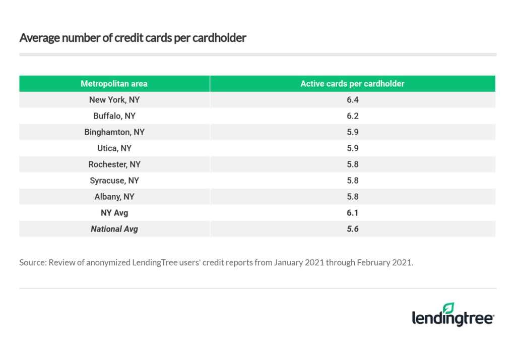 New York City residents have the most credit cards per cardholder at 6.4, while Albany, Rochester and Syracuse all rank at the bottom of the list at 5.8.