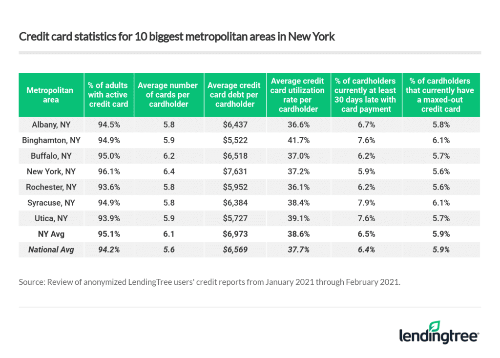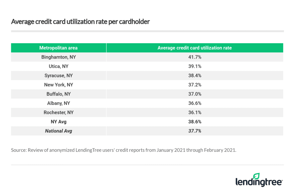 Binghamton cardholders have the state’s highest utilization rate at 41.7%, while Rochester cardholders’ rate is just 36.1%.