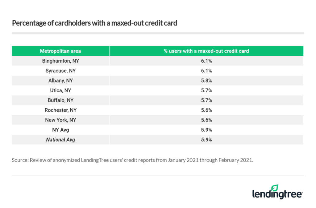 Binghamton cardholders, along with those in Syracuse, are the most likely to have a maxed-out credit card. 6.1% of cardholders in each city have maxed-out credit cards.