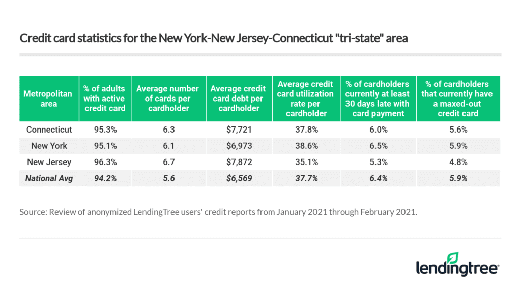 The bad news? New York cardholders have higher utilization rates and are more likely to be late with a payment and max out a card than the other two states.