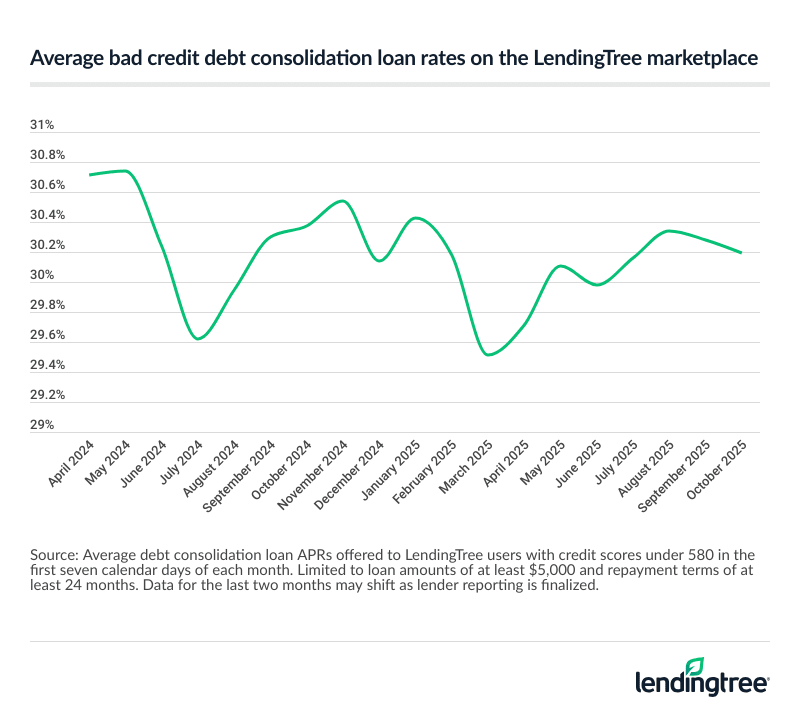 Rates for borrowers with a credit score below 580 have remained under 31.00% for over a year. The average debt consolidation loan rate for bad credit on the LendingTree marketplace was 30.19% APR in October 2025.