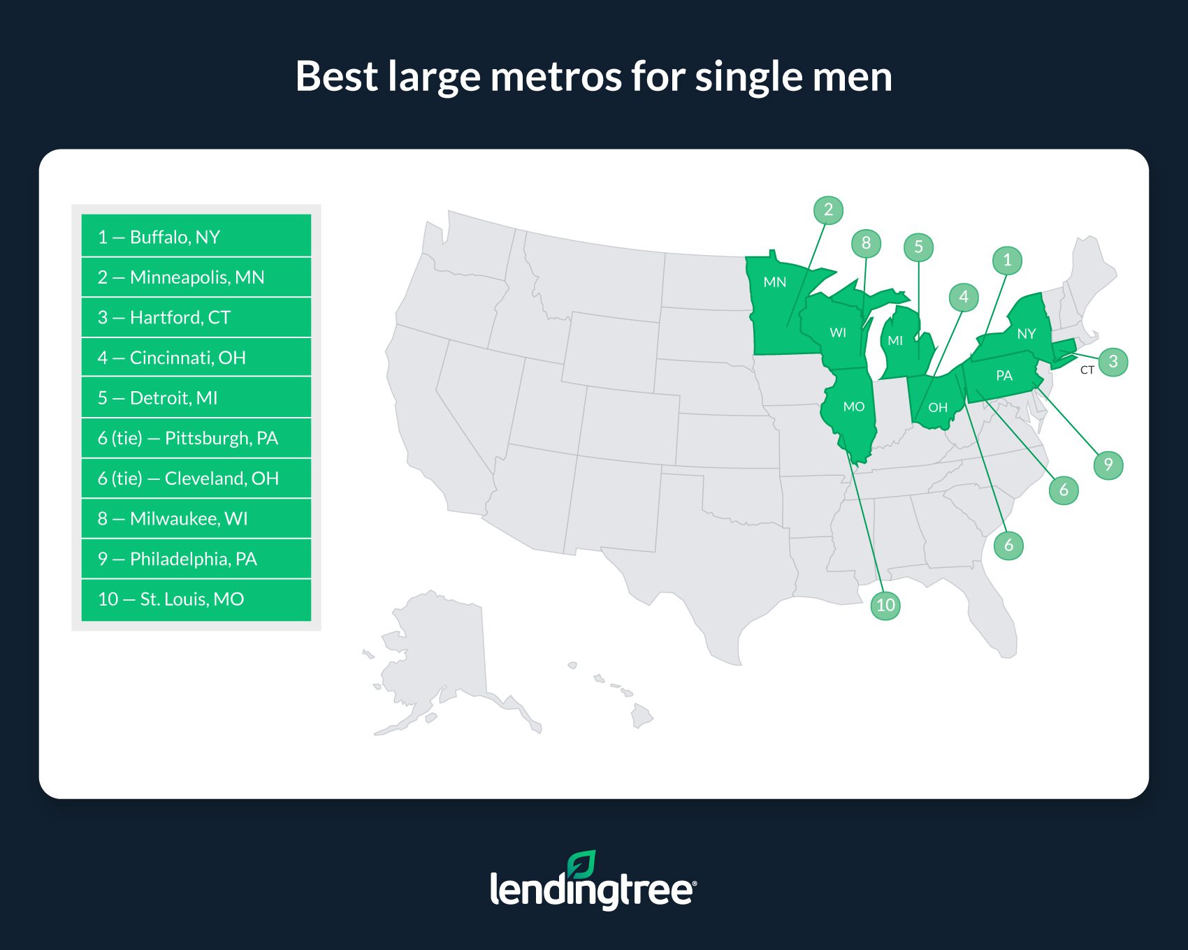 • Buffalo, N.Y., is the best metro for single men. While Buffalo is often overshadowed by its downstate sibling, New York City, it can be an excellent place for single men to live. The western New York metro boasts the highest homeownership rate for men who don’t live with a spouse and the shortest commute time of the metros featured in our study — and it’s relatively affordable for single men renters and homeowners.