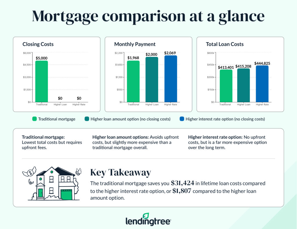 Traditional mortgage with closing costsNo-closing-cost mortgage with higher loan amountNo-closing-cost mortgage with higher interest rate