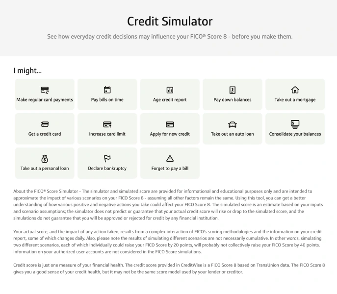 CreditWise’s credit score simulator helps you plan your next financial move by predicting how different actions will affect your credit. Here’s what it might look like: