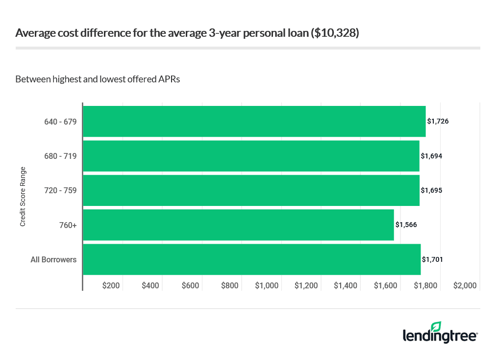 A person with a 760+ credit score saw a low rate of 7.55% APR and a high rate of more than double that amount — 16.38% APR. On a three-year personal loan valued at $10,328 — the average amount sought by borrowers — accepting that high rate could add an additional $1,566.11 to the cost of the loan.